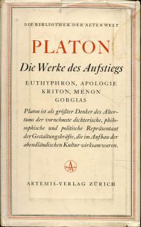Platon: Die Werke des Aufstiegs. Euthyphron, Apologie, Kriton, Gorgias, Menon. Zürich: Artemis 1948. 8°. XLIV, 321 S., Leinen (Besitzervermerk auf Vorsatz; Schutzumschlag teilweise befleckt, mit kleinen Einrissen und angestaubt; Papier altersbedingt leicht gebräunt; sonst gut erhalten) (=Die Bibliothek der Alten Welt; Griechische Reihe, 11)