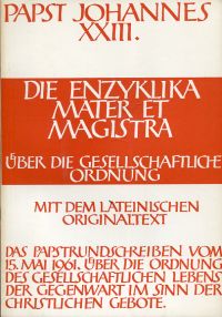 Johannes XXII.: Die Enzyklika Mater et Magistra. Über die gesellschaftliche Ordnung. Mit dem lateinischen Originaltext. Vom 15. Mai 1961. Über die Ordnung des gesellschaftlichen Lebens der Gegenwart im Sinn der christlichen Gebote. Luzern [u.a.]: Rex 1961. 8°. 80 S., broschiert (Einband mit leichten Gebrauchsspuren; Papier leicht gebräunt; sonst gut erhalten)
