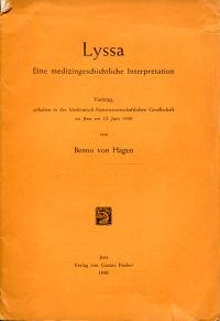Hagen, Benno von: Lyssa. Eine medizingeschichtliche Interpretation. Vortrag, gehalten in der Medizinisch-Naturwissenschaftlichen Gesesllschaft zu Jena am 13. Juni 1940. Jena: Fischer 1940. gr. 8. 29 S., broschiert (Ex Libris auf Innenumschlag; wenig bestossen; Seiten nicht aufgeschnitten; Fehlstelle in Umschlag ohne Textverlust; sonst altersgemäss gut erhalten)