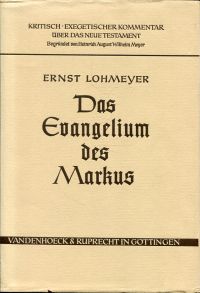 Lohmeyer, Ernst: Das Evangelium des Markus. 16. Aufl. Göttingen: Vandenhoeck & Ruprecht 1963. gr.-8°. 368 S., Beilage: Ergänzungsheft, 2., ergänzte Auflage 1963, 44 S., Leinen Schutzumschlag mit leichten Randläsuren; Ergänzungsheft leicht bestossen; sonst gut erhalten) (=Kritisch-exegetischer Kommentar über das Neue Testament. Begründet von Heinrich August Wilhelm Meyer. Erste Abteilung, 2. Band – 16. Aufl.) Text in Fraktur.