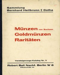Versteigerungskatalog der Sammlung Bernhard Heilbrunn, Gotha. Münzen von Sachsen, Goldmünzen und Raritäten. 5. Oktober 1931 und folgende Tage. Berlin: Robert Ball Nachf. 1931. Lex.-8°. VII, 65 S., 20 Tafeln mit zahlreichen sw-Abbildungen, broschiert (neuer Rücken; Einband angestaubt und wenig abgegriffen; Ecken leicht bestossen; handschriftliche Vermerke auf Umschlag vorne; sonst altersgemäss gut erhalten) (=Versteigerungs-Katalog; 5)