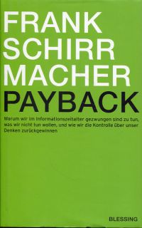 Schirrmacher, Frank: Payback. Warum wir im Informationszeitalter gezwungen sind, zu tun, was wir nicht tun wollen, und wie wir die Kontrolle über unser Denken zurückgewinnen. 3. Aufl. München: Blessing 2009. 8°. 239 S., gebunden (Mängelstempel auf Buchblock; gut erhalten)