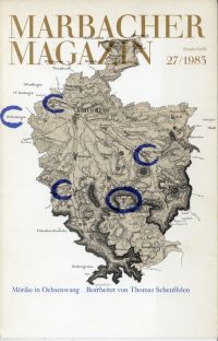 Scheuffelen, Thomas [Bearb.]: Mörike in Ochsenwang. [für die Ausstellung im Mörikehaus in Bissingen-Ochsenwang]. Marbach am Neckar: Deutsche Schillergesellschaft 1983. 8°. 79 S., sw-Abbildungen, engl. broschiert (private Widmung auf Vorsatz verso; Umschlag teilweise angebräunt befleckt; sonst gut erhalten) (=Marbacher Magazin ; 27 : Sonderheft)