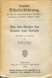 Aner, Karl: Aus den Briefen des Paulus nach Korinth. Verdeutlicht und ausgelegt von Dr. Karl Aner, Pfarrer in Charlottenburg. Tübingen: J. C. B. Mohr (Paul Siebeck) 1913. 8°. 56 S., broschiert (Umschlag lädiert und angebräunt; Seiten nicht beschnitten) (=Religionsgeschichtliche Volksbücher für die deutsche christliche Gegenwart. VI. Reihe, 1. Heft)