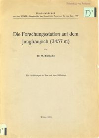 Mörikofer, W.: Die Forschungsstation auf dem Jungfraujoch (3457 m). Wien: Julius Springer 1931. 4°. 8 S., 2 Abb. im Text, 1 farbige Bildtafel beigelegt. geheftet (Bibliotheksexemplar; Bibliotheksvermerke; Umschlag mit Fehlstelle ohne Textverlust; Rücken eingerissen) (=Sonderabdruck aus dem 39. Jahresbericht des „Sonnenblick-Vereins“ für das Jahr 1930)