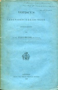 Brunner, Julius: Vopiscus Lebensbeschreibungen. Leipzig: Teubner, 1868. 8°. 320 S., broschiert (private Widmung des Verfassers auf Umschlag; teilweise stockfleckig) (=Untersuchungen zur römischen Kaisergeschichte, / hrsg. von Max Büdinger ; 2)