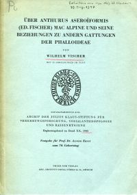 Vischer, Wilhelm: Über Anthurus aseroïformis (Ed. Fischer) Mac Alpine und seine Beziehungen zu andern Gattungen der Phalloideae. Zürich: Orell Füssli 1945. 8°. S. 556-565, sw-Abbildungen und Illustrationen, broschiert (leichte Gebrauchsspuren; handschriftliche Vermerke auf Umschlag) (=Separatdruck aus: Archiv der Julius Klaus-Stiftung für Vererbungsforschung, Sozialanthropologie und Rassenhygiene; Ergänzungsband zu Band XX, 1945)