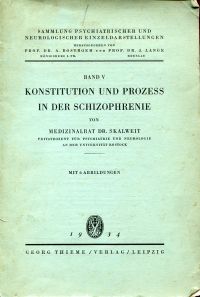 Skalweit, Wolf: Konstitution und Prozess in der Schizophrenie. Leipzig: G. Thieme 1934. Lex.-8°. 88 S., 6 Abbildungen, Broschiert Einband mit Gebrauchsspuren und abgegriffen; Papier altersbedingt leicht gebräunt; Seiten nicht beschnitten) (=Sammlung psychiatrischer und neurologischer Einzeldarstellungen; 5)