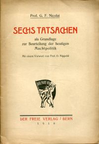 Nicolai, Georg Friedrich/Nippold, Otfried: Sechs Tatsachen als Grundlage zur Beurteilung der heutigen Machtpolitik. Bern: Freie Verlag 1918. 8°. VII, 35 S., geheftet (Einband mit Gebrauchsspuren; Papierbedingt gebräunt; sonst altersgemäss gut erhalten)