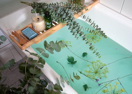 bildreich karten PK 1068: kräuterbad. Querformat. (Badewanne, Kräuter, Eukalyptus, Dill, Lavendel, Wellness) Mindestbestellmenge: 15 Karten (auch assortiert).