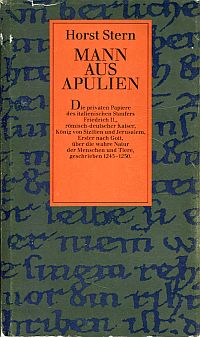 Stern, Horst: Mann aus Apulien. Die privaten Papiere des italienischen Staufers Friedrich II., römisch-deutscher Kaiser, König von Sizilien und Jerusalem, Erster nach Gott, über die wahre Natur der Menschen und der Tiere geschrieben 1245-1250. Zürich: Ex Libris 1988. 8°. 480 S., Leinen Schutzumschlag mit Randläsuren; Papierbedingt gebräunt; gut erhalten)