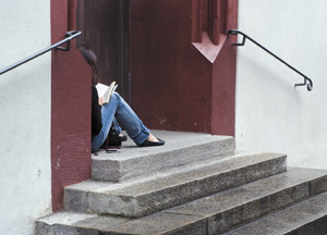 bildreich karten PK 305: refugium. Querformat. 2007. (Jeans, Student, Hauseingang, Treppe, Regen, Lesen, Pause)
