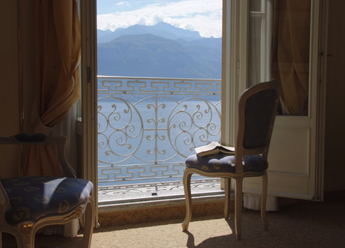 bildreich karten PK 625: ein tag im august. Querformat. (Fenster, Vorhang, Wind, Brise, Windstoss, Süden, Haus, Balkon, Hotel, Zimmer, Schlafzimmer, Hotelzimmer, Stuhl, Buch, Lesen, Geländer, See) Mindestbestellmenge: 15 Karten (auch assortiert).