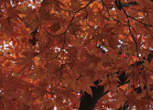 bildreich karten PK 683: rot in rot I. Querformat. (Kyoto, Garten, Tempelgarten, Ahorn, Baum, Regen)