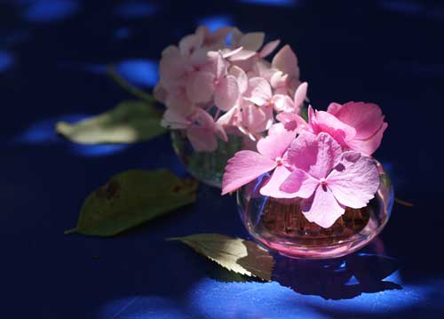 bildreich karten PK 727: sommerlicht. Querformat. 2011. (Blüten, Vase, Minivase, Tisch, Gartentisch, Garten, Licht, Schatten)