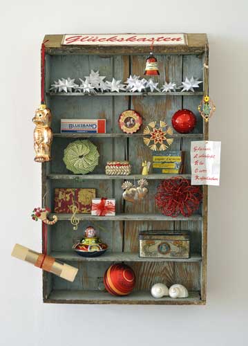bildreich karten PK 873: glückskasten. Hochformat. (Advent, Adventskalender, Setzkasten, Regal, Geschenke, Kugeln, Muscheln, Brief, Botschaft, Mundharmonika, Sterne, Bär)