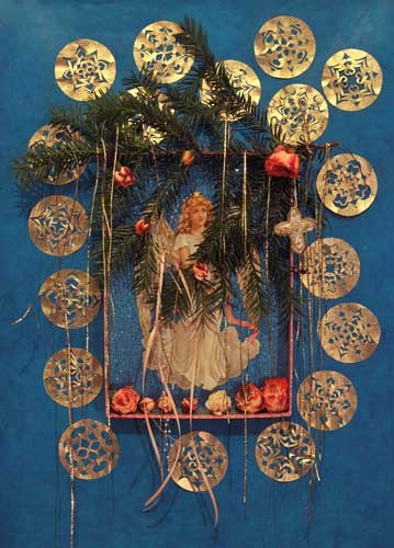 bildreich karten PK 993: rosenhag und sternenglanz. Hochformat. (Krippe, Glanzbild, Scherenschnitt, Gold, Rosen, Engel, Tannenzweig) Mindestbestellmenge: 15 Karten (auch assortiert).