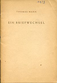 Mann, Thomas: Ein Briefwechsel. 9.-15. Tausend. Zürich: Oprecht 1937. 8°. 16 S., geheftet (Besitzervermerk auf Vorsatz; Papier leicht gebräunt; 1 Ecke wenig bestossen; Marginalie auf Umschlag, dieser angestaubt und befleckt; ; sonst gut erhalten) Betrifft: Entziehung des Ehrendoktor-Titels durch die Univ. Bonn