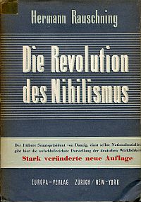 Rauschning, Hermann: Die Revolution des Nihilismus. Kulisse und Wirklichkeit im Dritten Reich. [5. Aufl.], 13. – 15. Tsd., ergänzte und verbesserte Auflage. Zürich: Europa 1938. 8°. 498 S., Engl. broschiert (Einband mit Gebrauchsspuren; leicht lichtrandig; sonst gut erhalten)