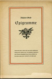 Grob, Johann: Epigramme. Bern: Francke 1939. 8°. 64 S., Pappband (Besitzervermerk auf Vorsatz; Ex Libris auf Innendeckel; leicht stockfleckig; sonst altersgemäss gut erhalten) CHF 12.00 |
