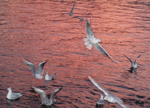 bildreich karten PK 231: tagenthoben. Querformat. 2006. (Möwen, Vögel, Dämmerung, Abendlicht, Abendrot)
