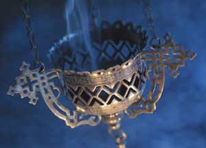 bildreich karten PK 369: agia varvara. Querformat. (Räuchern, Räuchergefäss, Weihrauch, Silber, Kirche, Rauch, Duft) Mindestbestellmenge: 15 Karten (auch assortiert).