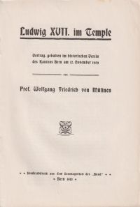 Mülinen, Wolfgang Friedrich von: Ludwig XVII. im Temple. Vortrag, gehalten im Historischen Verein des Kantons Bern am 12. November 1909. Bern: Der Bund 1910. 8°. 23 S., Geheftet (Umschläge teilweise leicht abgegriffen; altersgemäss gut erhalten) (=Sonderabruck aus dem Sonntagsblatt des „Bund“) Text in Fraktur.
