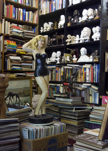 bildreich karten PK 644: antiquariat der musik. Hochformat. (Marilyn Monroe, Figur, Büsten, Musiker, Komponisten, Musikantiquariat, Musikbuchhandlung, Trösch, Zürich, Schallplatten, Platten)