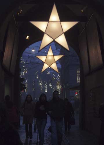 bildreich karten PK 754: sternentor. Hochformat. (Weihnachtsschmuck, Weihnachtsdekoration, Stern, Zytglogge, Bern, Tor, Torbogen, Abend, Abendlicht, Advent, Bummel) Mindestbestellmenge: 15 Karten (auch assortiert).
