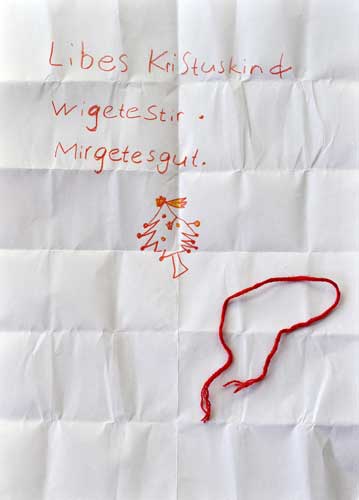 bildreich karten PK 872: vorweihnaechtliche kontaktaufnahme. Hochformat. (Brief, Kind, Dialog, Zeichnung, Schrift, Wolle, Band, Faden, Schnur, Falten, gefaltet, Papier, Advent, Christkind, Jesuskind) Mindestbestellmenge: 15 Karten (auch assortiert).